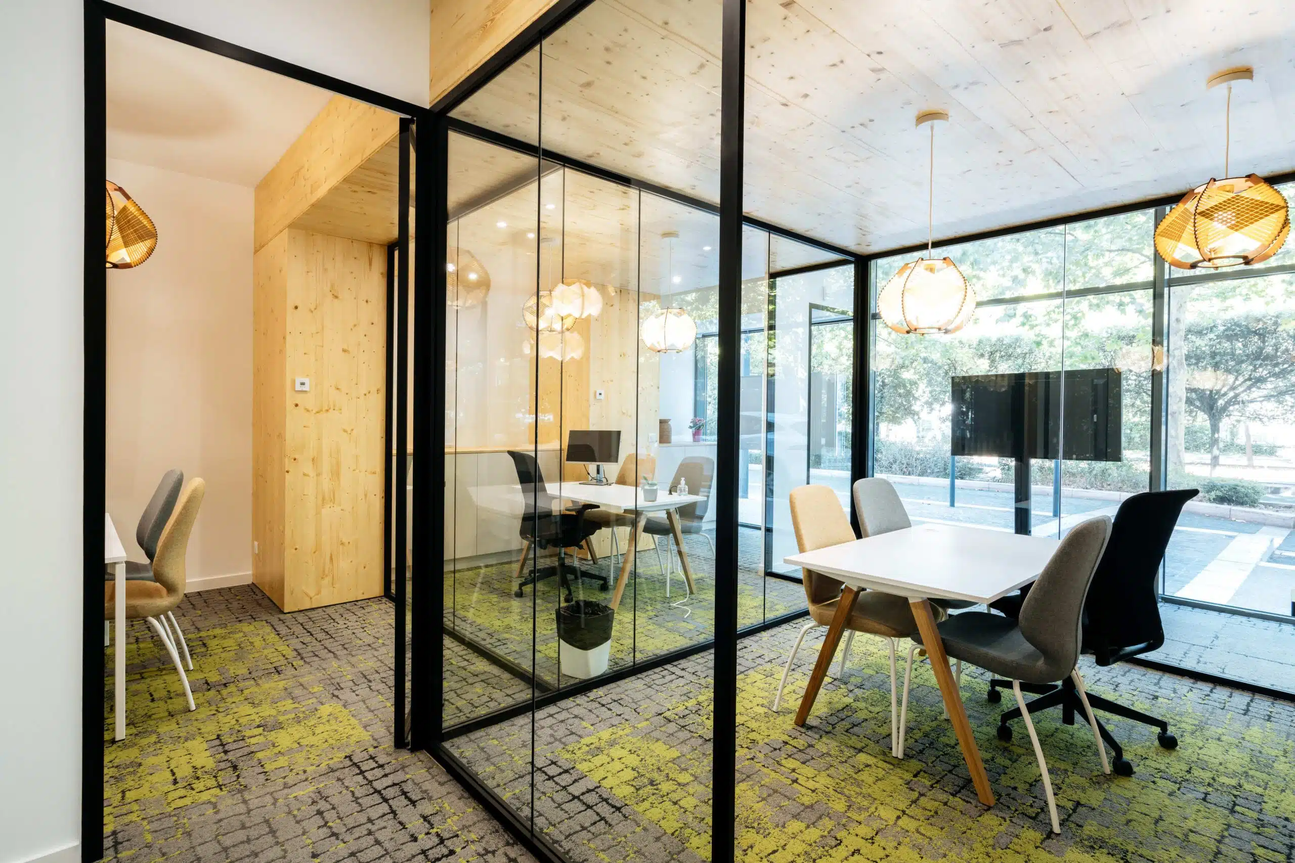 Chaque matériau, sélectionné avec soin, sculpte l’atmosphère des bureaux et apporte chaleur et raffinement. Le pin, omniprésent au cœur de l’espace, s’allie subtilement aux autres éléments et crée une harmonie singulière entre nature et architecture. Ce choix esthétique insuffle une énergie douce dans chaque recoin du lieu.